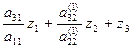Вычтем из второго уравнения первое, умноженное на При этом во втором уравнении будет уничтожен коэффициент при х 1. Затем из третьего уравнения также вычтем первое, умноженное на Проделав аналогичные преобразования с остальными уравнениями системы, превратим в нуль все коэффициенты первого столбца, кроме элемента а 11. Получим следующую систему: