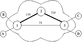 Задача маршрутизации, в свою очередь, включает в себя две подзадачи: · определение маршрута; · оповещение сети о выбранном маршруте. Определить маршрут означает выбрать последовательность транзитных узлов и их интерфейсов, через которые надо передавать данные, чтобы доставить их адресату. Определение маршрута — сложная задача, особенно когда конфигурация сети такова, что между парой взаимодействующих сетевых интерфейсов существует множество путей. Чаще всего выбор останавливают на одном оптимальном по некоторому критерию маршруте. В качестве критериев оптимальности могут выступать, например, номинальная пропускная способность и загруженность каналов связи; задержки, вносимые каналами; количество промежуток транзитных узлов; надежность каналов и транзитных узлов. Маршрут может определяться эмпирически («вручную») администратором сети, но этот подход к определению маршрутов мало пригоден для большой сети со сложной топологией. В этом случае используются автоматические методы определения маршрутов. Для этого конечные узлы и другие устройства сети оснащаются специальными программными средствами, которые организуют взаимный обмен служебными сообщениями, позволяющий каждому узлу составить свое «представление» о сети. Затем на основе собранных данных программными методами определяются рациональные маршруты. При выборе маршрута часто ограничиваются только информацией о топологии сети. Этот подход иллюстрирует рис. 2.15. Для передачи трафика между конечными узлами А и С существует два альтернативных маршрута: А-1-2-3-С и А-1-3-С. Если мы учитываем только топологию, то выбор очевиден — маршрут А-1-3-С, который имеет меньше транзитных узлов.
