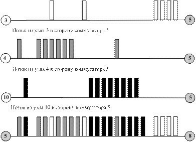 Пакеты, принадлежащие как одному и тому же, так и разным информационным потокам, при перемещении по сети могут «перемешиваться» между собой, образовывать очереди и «тормозить» друг друга. На пути пакетов могут встретиться линии связи, имеющие разную пропускную способность. В зависимости от времени суток может сильно меняться и степень загруженности линий связи, В таких условиях не исключены ситуации, когда пакеты, принадлежащими одному и тому же потоку, могут перемещаться по сети с разными скоростями и даже прийти к месту назначения не в том порядке, в котором они были отправлены. Разделение данных на пакеты позволяет передавать неравномерный компьютерный трафик более эффективно, чем в сетях с коммутацией каналов. Это объясняется тем, что пульсации трафика от отдельных компьютеров носят случайный характер и распределяются во времени так, что их пики чаще всего не совпадают. Поэтому когда линия связи передает трафик большого количества конечных узлов, то в суммарном потоке пульсации сглаживаются, и пропускная способность линии используется более рационально, без длительных простоев. Это эффект иллюстрируется рис. 3.7, на котором показаны неравномерные потоки пакетов, поступающие от конечных узлов 3,4 и 10 в сети, изображенной на рис. 3.6.