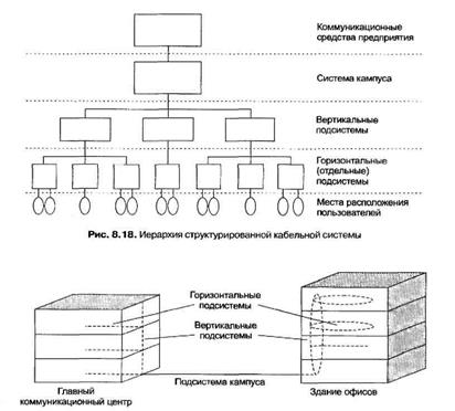 Структурированная кабельная система (Structured Cabling System, SCS) здания — это набор коммутационных элементов (кабелей, разъемов, коннекторов, кроссовых панелей и шкафов), а также методика их совместного использования, которая позволяет создавать регулярные, легко расширяемые структуры связей в вычислительных сетях. Здание само по себе представляет собой достаточно регулярную структуру — оно состоит из этажей, а каждый этаж, в свою очередь, состоит из определенного количества комнат, соединенных коридорами. Структура здания предопределяет структуру его кабельной системы. Структурированная кабельная система здания представляет собой своего рода «конструктор», с помощью которого проектировщик сети строит нужную ему конфигурации из стандартных кабелей, соединенных стандартными разъемами и коммутируемых стандартных кроссовых панелях. При необходимости конфигурацию связей можно легко изменить — добавить компьютер, сегмент, коммутатор, изъять ненужное оборудовали поменять соединение между компьютером и концентратором. Наиболее детально на сегодня разработаны стандарты кабельных систем зданий, при этом иерархический подход к процессу создания такой кабельной системы позволяет назвать ее структурированной. На основе SCS здания работает одна или несколько локальных сетей организаций или подразделений одной организации, размещенной в этом здании SCS планируется и строится иерархически с главной магистралью и многочисленна ответвлениями от нее (рис. 8.18). Типичная иерархия SCS включает (рис. 8.19):