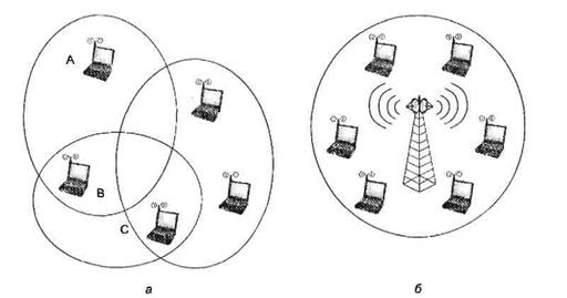 Рис. 12.14. Связность беспроводной локальной сети: а — специализированная беспроводная сеть, б — беспроводная сеть с базовой станцией Беспроводные локальные сети считаются перспективными для таких применений, в которых сложно или невозможно использовать проводные сети. Области применения беспроводных локальных сетей. 1. Домашние локальные сети. Когда в доме появляется несколько компьютеров, организация домашней локальной сети становится насущной проблемой. 2. Резидентный доступ альтернативных операторов связи, у которых нет проводного, доступа к клиентам, проживающим в многоквартирных домах, 3. Так называемый «кочевой» доступ в аэропортах, железнодорожных вокзалах и т. п. 4. Организация локальных сетей в зданиях, где нет возможности установить современную кабельную систему, например в исторических зданиях с оригинальным интерьером. 5. Организация временных локальных сетей, например, при проведении конференций. 6. Расширения локальных сетей. Иногда одно здание предприятия, например испытательная лаборатория или цех, может быть расположено отдельно от других. Небольшое число рабочих мест в таком здании делает крайне невыгодным прокладку к нему отдельного кабеля, поэтому беспроводная связь оказывается более рациональным вариантом. 7. Мобильные локальные сети. Если пользователь хочет получать услуги сети, перемещаясь из помещения в помещение или из здания в здание, то здесь конкурентов у беспроводной локальной сети просто нет. Классическим примером такого пользователя является врач, совершающий обход и пользующийся своим ноутбуком для связи с базой данных больницы. Date: 2015-07-24; view: 1216; Нарушение авторских прав |