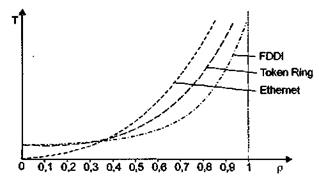 Мост локальной сети (LAN bridge), или просто мост, появился как средство построения крупных локальных сетей на разделяемой среде, так как невозможно построить достаточно крупную сеть на одной разделяемой среде Использование единой разделяемой среды в сети Ethernet приводит к нескольким очень жестким ограничениям: · общий диаметр сети не может быть больше 2500 м; · количество узлов не может превышать 1024 (для сетей Ethernet на коаксиале это ограничение еще жестче). На рис, 13.1 показана зависимость задержки доступа к среде передачи от загруженности сети, полученные для сетей Ethernet, Token Ring и FDDI путем имитационного моделирования.
