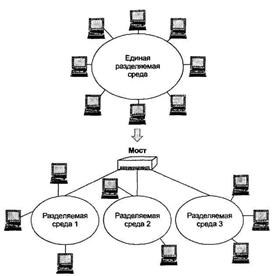 Как видно из рисунка, всем технологиям присуща качественно одинаковая картина экспоненциального роста величины задержек доступа при увеличении коэффициента использования сети. Однако их отличает порог, при котором наступает резкий перелом в поведении сети, когда почти прямолинейная зависимость переходит в крутую экспоненциальную. Для всего семейства технологий Ethernet — это 30-50 % (сказывается эффект коллизий), для технологии Token Ring — 60 %, а для технологии FDDI — 70-80 %. Ограничения, возникающие из-за использования единой разделяемой среды, можно преодолеть, выполнив логическую структуризацию сети, то есть, сегментировав единую разделяемую среду на несколько и соединив полученные сегменты сети некоторым коммуникационным устройством, которое не передает данные побитно, как повторитель, а базирует кадры и передает их затем в тот или иной сегмент в зависимости от адреса назначения кадра (рис 13.2) Нужно отличать логическую структуризацию от физической. Концентраторы стандарта 10Base-T позволяют построить сеть, состоящую из нескольких сегментов кабеля на витой паре, но это — физическая структуризация, так как логически все эти сегменты представляют собой единую разделяемую среду. Мост долгое время был основным типом устройств, которые использовались для логической структуризации локальных сетей. Сейчас, мосты заменили коммутаторы, но так как алгоритм их работы повторяет алгоритм работы моста, результаты их применения имеют ту же природу, они только усиливаются за счет гораздо более высокой производительности коммутаторов. Помимо мостов/коммутаторов для структуризации локальных сетей можно использовать маршрутизаторы, но они являются более сложными и дорогими устройствами, к тому же всегда требующими ручного конфигурирования, поэтому их применение в локальных сетях ограничено. Логическая структуризация локальной сети позволяет решить несколько задач, основные из которых — это повышение производительности, гибкости и безопасности, а также улучшение управляемости сети.