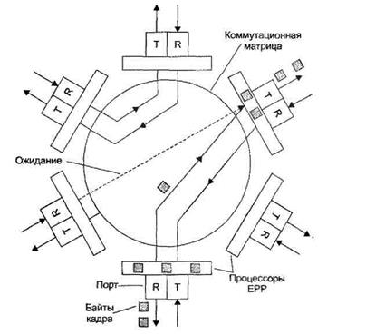 Каждый из 8 портов 10Base-T обслуживается одним процессором пакетов Ethernet (Ethernet Packet Processor, EPP). Кроме того, коммутатор имеет системный модуль, который координирует работу всех процессоров ЕРР, в частности ведет общую адресную таблицу коммутатора для передачи кадров между портами используется коммутационная матрица. Она функционирует по принципу коммутации каналов, соединяя порты коммутатора. При поступлении кадра в какой-либо порт соответствующий процессор ЕРР буферизует несколько первых байтов кадра, чтобы прочитать адрес назначения. После получения адреса назначения процессор сразу же приступает к обработке кадра, не дожидаясь прихода остальных его байтов. 1. Процессор ЕРР просматривает свой кэш адресной таблицы, и если не находит так нужного адреса, обращается к системному модулю, который работает в многозадачном режиме, параллельно обслуживая запросы всех процессоров ЕРР. Системный модуль производит просмотр общей адресной таблицы и возвращает процессору найденную строку, которую тот буферизует в своем кэше для последующего использования. 2. Если адрес назначения найден в адресной таблице и кадр нужно отфильтровать, процессор просто прекращает записывать в буфер байты кадра, очищает буфер и ждет поступления нового кадра 3. Если же адрес найден и кадр нужно передать на другой порт, процессор, продолжая прием кадра в буфер, обращается к коммутационной матрице, пытаясь установить в пей путь, связывающий его порт с портом, через который идет маршрут к адресу назначения. Коммутационная матрица способна помочь только в том случае, если порт адреса назначения в этот момент свободен, то есть, не соединен с другим портом данного коммутатора; 4. Если же порт занят, то, как и в любом устройстве с коммутацией каналов, матрица в соединении отказывает, в этом случае кадр полностью буферизуется процессором входного порта, после чего процессор ожидает освобождения выходного порта и образования коммутационной матрицей нужного пути. 5. После того как нужный путь установлен, в него направляются буферизованные байты кадра, которые принимаются процессором выходного порта. Как только процессор выходного порта получает доступ к подключенному к нему сегменту Ethernet по алгоритму CSMA/CD, байты кадра сразу же начинают передаваться в сеть. Процессор входного порта постоянно хранит несколько байтов принимаемого кадра в своем буфере, что позволяет ему независимо и асинхронно принимать и передавать байты кадра (рис. 13.9).