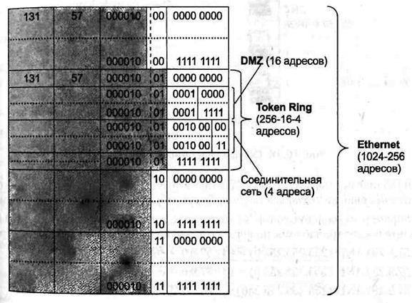 Рассмотрим пример использования масок для организации перекрывающихся адресных пространств. Пусть на некотором предприятии было принято решение обратиться к поставщику услуг для получения пула адресов, достаточного для создания сети, структура, которой показана на рис. 16.15. Сеть клиента включает три подсети. Две из них — это надежно защищенные от внешних атак внутренние сети отделов: сеть Ethernet на 600 пользователей и сеть Token Ring на 200 пользователей. Предприятие также предусматривает отдельную, открытую для доступа извне сеть на 10 узлов, главное назначение которой — предоставление информации в режиме открытого доступа для потенциальных клиентов. Такого рода участки корпоративной сети, в которых располагаются веб-серверы, FTP-серверы и другие источники публичной информации, называют демилитаризованной зоной (Demilitarized Zone, DMZ). Ещё одна сеть на два узла потребуется для связи с поставщиком услуг, то есть общее число адресов, требуемых для адресации сетевых интерфейсов, составляет 812. Кроме того, необходимо, чтобы пул доступных адресов включал для каждой из сетей широковещательные адреса, состоящие только из единиц, а также адреса, состоящие только из нулей. Учитывая также, что в любой сети адреса всех узлов должны иметь одинаковые префиксы, становится очевидным, что минимальное количество адресов, необходимое клиенту для построения задуманной сети, может значительно отличаться от значения 812, полученного простым суммированием. В данном примере поставщик услуг решает выделить клиенту непрерывный пул из 1024 адресов. Значение 1024 выбрано как наиболее близкое к требуемому количеству адресов, равному степени двойки (210 = 1024). Поставщик услуг выполняет поиск области такого размера в имеющимся у него адресном пространстве — 131.57.0.0/16, часть которого, как показано на рис. 16.16, уже распределена. Обозначим распределенные участки и владеющих ими клиентов через SI, S2 и S3. Поставщик услуг находит среди нераспределенных еще адресов непрерывный участок размером 1024 адреса, начальный адрес которого кратен размеру данного участка. Таким образом, наш клиент получает пул адресов 131.57.8.0/22, обозначенный на рисунке через S.