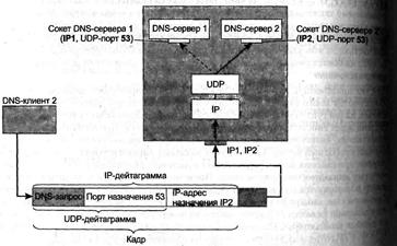 Существует и обратная задача: данные, генерируемые разными приложениями, работающими на одном конечном узле, должны быть переданы общему для всех них протокольному модулю IP для последующей отправки в сеть. Эту работу, называемую мультиплексированием, тоже выполняют протоколы TCP и UDP. Протоколы TCP и UDP ведут для каждого приложения две системные очереди: очередь данных, поступающих к приложению из сети, и очередь данных, отправляемых этим приложением в сеть. Такие системные очереди называются портами, причем входная и выходная очереди одного приложения рассматриваются как один порт. Для идентификации портов им присваивают номера. Если процессы представляют собой популярные системные службы, такие как FTP, telnet, HТТР, TFTP, DNS и т. п., то за ними закрепляются стандартные назначенные номера, называемые также хорошо известными (well-known) номерами портов. Так, номер 21 закреплен за серверной частью службы удаленного доступа к файлам FTP, a 23 — за серверной частью службы удаленного управления telnet. Назначенные номера из диапазона от 0 до 1023 являются уникальными в пределах Интернета и закрепляются за приложениями централизованно. Для тех приложений, которые еще не стали столь распространенными, номера портов назначаются локально разработчиками этих приложений или операционной системой. На каждом компьютере операционная система ведет список занятых и свободных номеров портов. При поступлении запроса от приложения, выполняемого на данном компьютере, операционная система выделяет ему первый свободный номер. Такие номера называют динамическими. В дальнейшем все сетевые приложения должны адресоваться к данному приложению с указанием назначенного ему динамического номера порта. После того как приложение завершит работу, его номер возвращается в список свободных и может быть назначен другому приложению. Динамические номера являются уникальными в пределах каждого компьютера, но при этом обычной является ситуация совпадения номеров портов приложений, выполняемых на разных компьютерах. Как правило, клиентские части известных приложений (DNS, W WW, FTP, telnet и др.) получают динамические номера портов от ОС. В том и другом случаях это могут быть как назначенные, так и динамические номера. Диапазоны чисел, которых выделяются номера TCP- и UDP-портов, совпадают: от 0 до 1023 для назначенных и от 1024 до 65 535 для динамических. Стандартные назначенные номера портов уникально идентифицируют тип приложений (FTP, или HTTP, или DNS и т. д.), однако они не могут использоваться для однозначной идентификации прикладных процессов, связанных с каждым из этих типов приложений. Пусть, например, на одном хосте запущены две копии DNS-сервера — DNS-сервер 1, DNS сервер 2 (рис. 17.2). Каждый из этих DNS-серверов имеет хорошо известный UDP-порт 53. Какому из этих серверов нужно было бы направить запрос клиента, если бы в DNS-запросе в качестве идентификатора сервера был указан только номером порта?