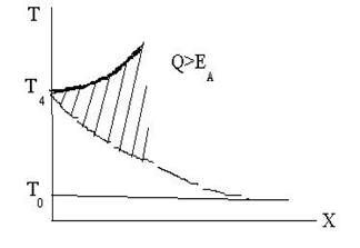 б) В среде, способной к экзотермической реакции, но Т2 недостаточна для возникновения прогрессивного процесса разогрева и самоускорения реакции, т.е. принесенная энергия меньше энергии активации.