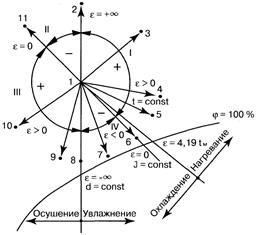 2. Влажный воздух одновременно нагревается и увлажняется и приобретает параметры точки 3. Угловой коэффициент луча процесса e3 > 0. Такой процесс протекает, когда приточный воздух ассимилирует тепло- и влаговыделения в помещении. 3. Влажный воздух увлажняется при постоянной температуре до параметров точки 4, e4 > 0. 4. Влажный воздух увлажняется и нагревается с повышением энтальпии до параметров точки 5. Так как энтальпия и влагосодержание воздуха увеличиваются, то e5 > 0. 5. Изменение состояния влажного воздуха происходит при постоянной энтальпии J 6 = J 1 = const.(изоэнтальпийный) Угловой коэффициент такого луча процесса e6 = 0, т.к. D J = 0. Фактически угловой коэффициент луча процесса при изоэнтальпийном увлажнении не равен нулю, т.к.