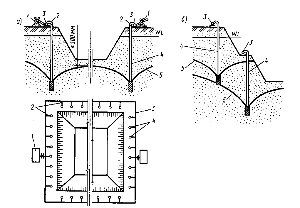 Рис.14.9. Схемы глубинного водопонижения: а – одноярусное расположение иглофиьлтров; б – то же, многоярусное; 1 – насосная станция; 2 – гибкие шланги; 3 – коллектор; 4 – иглофильтры; 5 – депрессионная воронка Иглофильтр состоит из стальной трубы d=38…50 мм, нижнем конце имеется фильтрующее устройство, через которое производится всасывание и откачка воды. Фильтр сконструирован так, что обеспечивается невозможностью выноса частиц. Возникающее при движении воды (от дна котлована к ИФУ) рис. 14.9 а, гидродинамическое давление способствует уплотнению грунтов а … - улучшению их структурных свойств.
