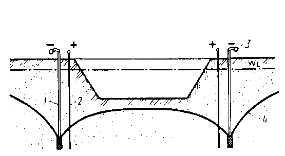Рис. 14.10. Схема электроосмотического водопонижения: 1 – иглофильтр катод; 2 – металлический стержень-анод; 3 – коллектор; 4 – депрессионная кривая