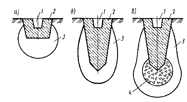 Рис. 12.8. Схемы устройства методом вытрамбовывания котлованов фундаментов с плоской подошвой (а), с заостренной подошвой обычного типа (б) и с уширенным основанием (в): 1 – стакан для установки колонны; 2 – фундамент; 3 – зона уплотнения; 4 – втрамбованный жесткий грунтовый материал