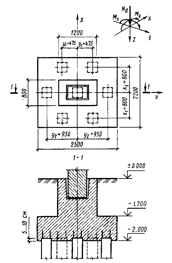 Рис. 11.16. Внецентренно нагруженный свайный фундамент