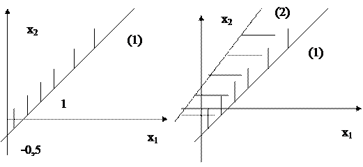 Если число входных параметров (искомых переменных) равно 2, то задача ЛП имеет наглядную графическую интерпретацию. Пример q (`x) = x1 - x2 ® min D: x1 - 2x2 £ 1 -2 x1 + x2 £ 2 3x1 + x2 £ 3 x1 ³ 0, x2 ³ 0 1 этап графического решения – изображение на плоскости области D. 1 условие: x1 - 2x2 £ 1. Обозначим D1 – множество точек (x1; x2) удовлетворяющих 1-ому ограничению. Вся плоскость разбивается на множество точек Î D1 (условие выполнено) и Ï D1 (условие не выполнено). Построим границу области D1. Это будет множество точек x1 - 2x2 = 1. На плоскости это будет прямая x2 = 0,5 x1 – 0,5. Её можно построить по 2-м точкам: 1) x1=0; x2 = - 0,5 2) x1 =1; x2 =0. Полученная линия делит плоскость на 2 части. Одна часть удовлетворяет условию, вторая нет. Чтобы проверить какая часть удовлетворяет условию, надо взять любую точку и подставить в условие (1). Если оно выполняется для одной точки, то выполняется и для всей части. Например, (0;0). Условие (1) выполняется => множество D1 – это область выше прямой, штрихуем эту часть.