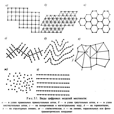 Регулярные ЦММ создают путем размещения точек в узлах геометрических сеток различной формы (треугольных, прямоугольных, шестиугольных), накладываемых на аппроксимируемую поверхность с заданным шагом. Наиболее часто применяют ЦММ с размещением исходных точек в узлах сеток квадратов (рис. 5.3,а) или равносторонних треугольников (рис. 5.3, б). Регулярные ЦММ в узлах правильных шестиугольных сеток (рис. 5.3, в) нашли применение при проектировании нефтепромысловых дорог в условиях равнинного рельефа Западной Сибири.