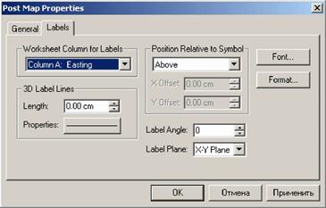 Кроме всего прочего, в этом окне в блоке «3D Label Lines» можно задать, каким образом будет указываться точка на трехмерной поверхности (например, на карте, созданной через пункт меню «Wareframe...»). Группа операторов, объединенная под названием «Position Relative to Symbol», необходима для определения положения подписи относительно точки поста: Above - выше; Below - ниже; Center - по центру; Left - слева; Right - справа. При выборе из этого списка пункта «User Defined» появляется доступ к строкам «X Offset», «Y Offset», где можно задать пользовательское положение подписи. Строка «Label Angle» - угол наклона подписи. В правом верхнем углу есть еще две кнопки: «Font.» - задает свойства шрифтов подписи; «Format...» - задает количество знаков, отводимых на написание подписи, в том числе после запятой.