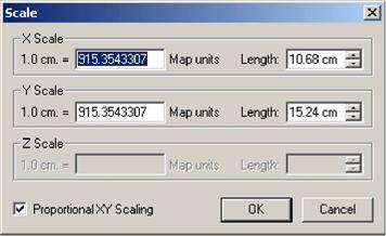 Кроме отображения карт по отдельности, их можно накладывать друг на друга и показывать совмещенно (операция «Overlay»). Для этого необходимо выбрать те карты, которые мы хотим наложить (используя Ctrl и указывая нужную карту или нажав клавишу F2 на клавиатуре, при этом выберутся все карты), выбрать пункт меню «Map» ^ «Overlay Maps». Для карт в Surfer можно задавать масштаб. Для этого необходимо выбрать нужную карту указателем курсора мыши и нажать левую клавишу мыши, а затем выбрать пункт главного меню «Map», подпункт «Scale». После этих действий появляется диалоговое окно «Scale» (рис. 8.15), где можно задать масштабы для каждой координаты. В данном окне можно установить пропорциональные масштабы для координат Х и Y, если включить опцию «Proportional XY Scaling». Когда мы выставляем масштаб для трехмерных отображений поверхности, то нам становится доступной последняя третья строка «Z Scale», в которой можно задать масштаб по координате Z.