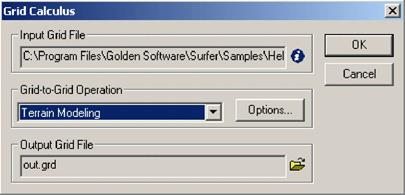 8.3. Операции с поверхностями Помимо создания поверхностей с использованием вышеперечисленных методов с поверхностями можно совершать различные математические операции (сложение, вычитание, умножение и т.д.). Можно изменять координаты регулярных сеток, рассчитывать различные показатели, основанные на вычислении производной первого и второго порядка и использовании «скользящего окна» разной формы и размера (сглаживание). Математические операции с сетками можно осуществлять, используя пункт меню «Grid», подпункт «Math...». После выбора этого пункта меню появляется диалоговое окно, предлагающее выбрать *.grd файл, с которым будут совершены определенные действия. Затем появляется окно «Grid Math» (рис. 8.16). Здесь в первой строчке под названием «Input Grid File A» указывается путь и имя файла, который мы указали в предыдущем диалоговом окне. Стоит заметить, что можно осуществить операцию с двумя моделями (например, сложить), тогда в строке «Input Grid File В», задаем еще одну поверхность. Модели А и В должны иметь равное количество строк и колонок (количество узлов по Х и Y в обеих моделях должно быть одинаковое). Вторая модель может и не использоваться, если мы хотим задействовать константу для вычисления новой модели. Тогда в последней строке вместо литеры В используется значение этой константы. В третьей строке «Output Grid File С» задается имя результирующей сетки.