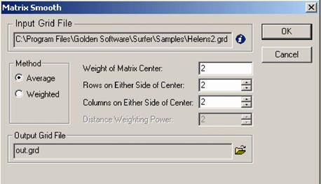 В Surfer эти расчеты реализованы в пункте главного меню «Grid», подпункте «Matrix Smooth...». После выбора этого пункта меню и задания файла с исходной моделью появляется диалоговое окно «Matrix Smooth» (рис. 8.21).