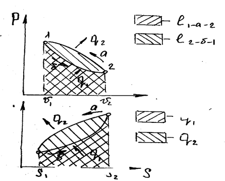 Изображение обратного цикла в любой из диаграмм производится только против часовой стрелки. Как видим работа расширения в обратном цикле больше работы сжатия (см. рис.), т.е.