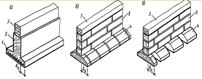 Рисунок 1.6. Ленточные фундаменты: а - монолитный; б - сборный сплошной; в - сборный прерывистый; 1- армированная лента; 2 - фундаментная стена; 3 - стена здания; 4- фундаментная подушка; 5 - стеновой блок
