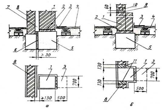 Рисунок 1.20. Основания под печи, располагаемые в нижнем этаже здания: а - у каменных стен здания; б - в проемах стен на уширении их фундаментов 1 - печь; 2 - гидроизоляция; 3 - предтопочный стальной лист; 4 - деревянный пол; 5 - кирпичный бутовый или бетонный фундамент; 6 - песок; 7 - открытая отступка; 8 - кирпичная стена; 9 - заделка раствором; 10 - перемычки стены; 11 - глухая разделка толщиной в полкирпича