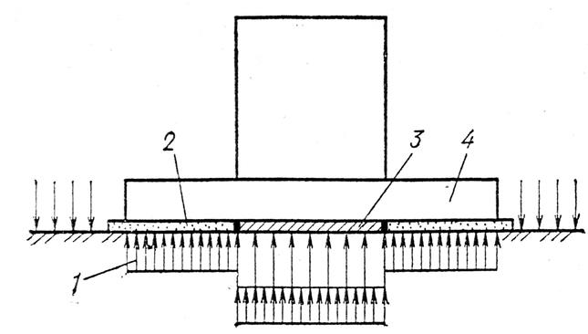 Рисунок 1.34. Фундамент на промежуточной подготовке: 1-эпюра контактных давлений; 2- рыхлый песок; 3- бетон; 4- фундамент