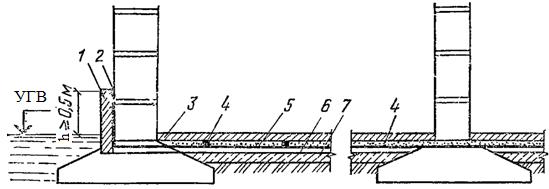 Практикой строительства выработаны различные способы предохранения конструкций и подземных помещений от подземных вод и влаги. Многие из этих мероприятий, выполняемые в период строительства, достаточно просты и эффективны. Но их устройство осложняется, а эффективность снижается, когда они выполняются уже в существующих зданиях и сооружениях. Защитные мероприятия бывают направлены на предохранение подземных сооружений и подвалов от сырости, затопления грунтовыми водами, от коррозии и разрушения материалов подземных конструкций. Выбор этих мероприятий зависит от гидрогеологических условий строительной площадки, сезонного колебания и возможного изменения уровня подземных вод, их агрессивности, особенностей конструкций и назначения помещений. Защита надземных помещений от грунтовой сырости ограничивается устройством по выровненной поверхности всех стен на высоте 15-20 см от верха отмостки или тротуара непрерывной водонепроницаемой прослойки из жирного цементного раствора или одного-двух слоев рулонного материла на битуме (рис 1.35). Этот слой составляет с бетонной подготовкой пола одно целое. В местах понижения пола устраивают дополнительную изоляцию.