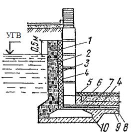 Рисунок 1.43. Изоляция фундаментов от сильноагрессивных вод: 1 –перемятая глина; 2,10 - обмазка битумом на три раза; 3 защитная стенка; 4 – рулонная изоляция; 5 –чистый пол; 6 –железобетонное перекрытие; 7 – защитный слой; 8- цементная стяжка; 9 – щебеночная или гравийная подготовка на битуме В горизонтальных конструкциях гидроизоляцию наклеивают на гладко выровненную цементной стяжкой поверхность подготовки и сверху предохраняют ее цементным или асфальтовым слоем толщиной 3-5 см. Гидростатическое давление воспринимается заделанными в стены или в опоры здания железобетонными плитами, обратно ребристыми и безбалочными перекрытиями, коробчатыми конструкциями (1.42), общими для пола и стен, и железобетонными плитами, перекрытыми металлическими балками. Когда гидростатическое давление воспринимается железобетонными перекрытиями, они одновременно могут использоваться как сплошные фундаменты плиты. При изоляции смежных конструкций их изолируемые поверхности должны быть притуплены фаской под углом 45 градусов или закруглены радиусом не менее10-15 см. Защита подземных конструкций от агрессивных вод сводится в зависимости от их агрессивности к приданию материалу большей химической стойкости или к изоляции их от смачивания грунтовыми водами. При наличии определенного источника агрессивных вод хорошие результаты дает устройство вокруг сооружения нейтрализационных барьеров – канав, заполненных известковым щебнем и камнем, которые нейтрализуют кислоту в воде и снижают ее агрессивность. Простейшей изоляцией от слабоагрессивных вод может быть глиняный замок из хорошо перемятой и плотно утрамбованной глины. В более агрессивных водах изоляция осуществляется химически стойкими оболочками. При сильноагрессивных водах поверхности конструкции с боков и снизу предохраняют оклеечной изоляцией из битумных рулонных материалов (рис.1.43). Изоляцию по подошве сооружения наносят на подготовку из тощего бетона. При весьма агрессивных водах конструкцию облицовывают клинкером на битуме или на специальном кислотостойком растворе.