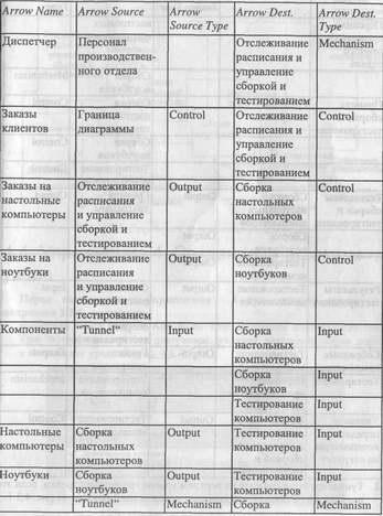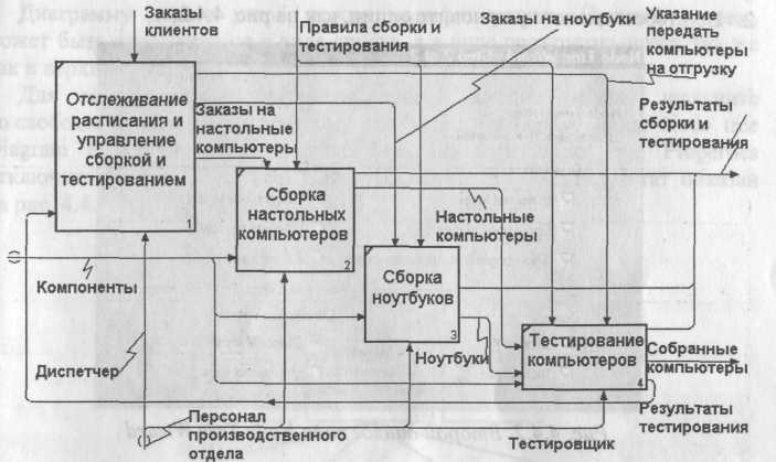 Декомпозируем работу "Сборка и тестирование компьютеров". В результате проведения экспертизы получена следующая информация. Производственный отдел получает заказы клиентов от отдела продаж по мере их поступления. Диспетчер координирует работу сборщиков, сортирует заказы, группирует их и дает указание на отгрузку компьютеров, когда они готовы. Каждые 2 часа диспетчер группирует заказы - отдельно для настольных компьютеров и ноутбуков - и направляет на участок сборки. Сотрудники участка сборки собирают компьютеры согласно спецификациям заказа и инструкциям по сборке. Когда группа компьютеров, соответствующая группе заказов, собрана, она направляется на тестирование. Тестировщики тестируют каждый компьютер и в случае необходимости заменяют неисправные компоненты. Тестировщики направляют результаты тестирования диспетчеру, который на основании этой информации принимает решение о передаче компьютеров, соответствующих группе заказов, на отгрузку. 1. На основе этой информации внесите новые работы и стрелки (табл. 4.3.1 и 4.3.2). Таблица 4.3.1. Работы диаграммы декомпозиции А2
