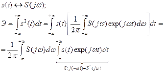 Полученное равенство называется равенством Парсеваля, имеет большое значение для анализа свойств электрических сигналов и устанавливает ызаимосвязь между энергией сигнала (при сопротивлении 1 Ом) и модулем его спектральной плотности. Между средней мощностью периодического сигнала и полученным соотношением имеется существенное различие. Операция усреднения осуществлялась нами делением отрезка сигнала за один период на величину Т. В случае же непериодического сигнала конечной длительности усреднение энергии за бесконечно большой период дает ноль и, следовательно, средняя мощность такого сигнала равна нулю. Из равенства Парсеваля видно, что величина S|w|2, имеющая смысл энергии, приходящейся на единицу полосы частот, может рассматриваться как спектральная плотность энергии сигнала.