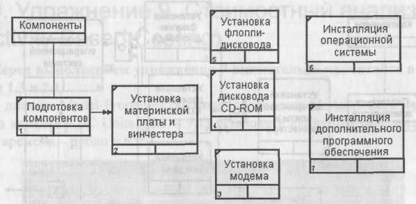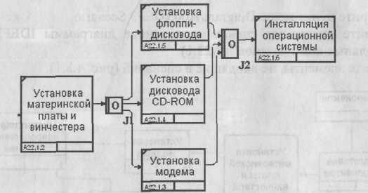 — _ палитры инструментов создайте объект ссылки. Внесите имя объекта внешней ссылки "Компоненты". Свяжите стрелкой объект ссылки и работу "Подготовка компонент". 5.Свяжите стрелкой работы "Подготовка компонентов" (выход) и "Установка материнской платы и винчестера". Измените стиль стрелки на Object Flow. В IDEF3 имя стрелки может отсутствовать, хотя BPwin показывает отсутствие имени как ошибку. Результат показан на рис. 4.7.2.
