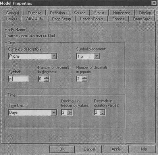 Перед выполнением упражнения 9 внимательно прочитайте подразделы 1.3 и 2.1. П. В диалоге Model Properties (вызывается из меню Mode/Model Properties) во вкладке ABC Units (рис. 4.9.1) установите единицы измерения денег и времени — рубли и часы.