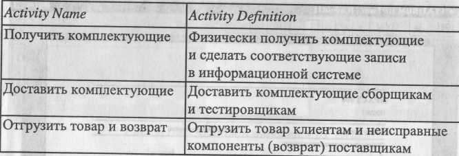 1.Перейдите на диаграмму АО и щелкните правой кнопкой мыщи по работе "Отгрузка и получение". В контекстном меню выберите Split Model. В появившемся диалоге Split Option установите опцию Enable Merge /Overwrite Option, внесите имя новой модели - "Отгрузка и получение" и щелкните по ОК. Обратите внимание, что у работы "Отгрузка и получение" появилась стрелка вызова. BPwin создал также новую модель "Отгрузка и получение". 2.Внесите свойства новой модели: Time Frame: AS-IS; Purpose: Документировать работу "Отгрузка и получение"; Viewpoint: Начальник отдела; Definition: Модель создается для иллюстрации возможностей BPwin по расщеплению и слиянию моделей Scope: Работы по получению комплектующих и отправке готовой продукции. 3.Декомпозируйте контекстную работу на 3 работы (табл. 4.11.1). Таблица 4.11.1. Декомпозиция работы "Отгрузка и получение"