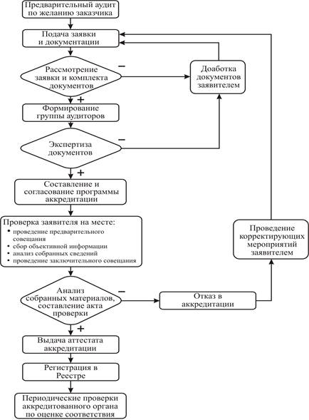 Рис. 3 – Этапы проведения аккредитации органов по оценке соответствия Назначенная группа аудиторов в месячный срок анализирует представленную информацию и документацию. В случае положительных результатов анализа работы по аккредитации продолжаются, и проводится проверка заявителя на месте. В случае отрицательных результатов анализа документы в 10-дневный срок возвращаются заявителю для доработки. Срок доработки не должен превышать 30 дней. После доработки заявитель присылает документы на повторное рассмотрение. Проверка заявителя на месте проводится назначенной группой по программе проверки. Проверка состоит из следующих основных этапов: · проведение предварительного совещания с руководством заявителя с целью определения плана проведения аккредитации; · сбор объективных сведений о соответствии заявителя критериям аккредитации; · анализ собранных объективных сведений и определение соответствия заявителя критериям аккредитации; · проведение заключительного совещания с руководством заявителя с целью обсуждения результатов проверки, составления и подписания протокола совещания с определением сроков устранения выявленных несоответствий. Назначенная группа аудиторов получает все собранные в результате проверки материалы и проводит их анализ. По результатам анализа не позднее 30 дней после проведения проверки главный аудитор составляет акт проверки с рекомендациями относительно аккредитации или об отказе в аккредитации по форме, определенной органом по аккредитации. Акт проверки вместе с отчетом заявителя о выполнении корректирующих мероприятий и необходимым комплектом документов подается в орган по аккредитации. Решение относительно аккредитации ООС принимает руководитель органа по аккредитации после получения акта проверки и всего комплекта документов. В случае принятия положительного решения орган по аккредитации выдает аттестат аккредитации установленного образца сроком действия до трех лет, заносит сведения об ООС в реестр и предоставляет право использования национального знака аккредитации. В случае отказа в аккредитации заявителю выдается в письменной форме уведомление, в котором указываются основания такого отказа. Орган по аккредитации проводит запланированные проверки аккредитованного ООС в 12-м и 24-м месяцах с момента вступления в действие аттестата аккредитации. Для этого орган по аккредитации назначает аудитора, кандидатура которого согласовывается с проверяемым аккредитованным ООС. В случае поступления обоснованной информации о несоответствии аккредитованного ООС критериям аккредитации орган по аккредитации осуществляет внеплановую проверку. В этом случае кандидатура аудитора не согласовывается с ООС. Количество внеплановых проверок не влияет на количество и периодичность запланированных проверок. В случае установления во время периодической проверки фактов несоответствия критериям аккредитации, аудитор имеет право требовать от ООС применения корректирующих мероприятий. По результатам периодической проверки аудитором, который ее осуществлял, составляется акт по установленной органом по аккредитации форме. Акт проверки должен содержать рекомендацию о возможности дальнейшей деятельности ООС или о необходимости временного прекращения действия или признан