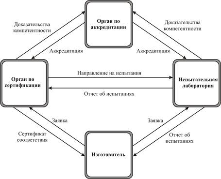Рис. 4 – Взаимосвязь аккредитации и сертификации За обеспечение качества продукции ответственность несет изготовитель, который должен выполнять требования стандартов ISO серии 9000 при производстве продукции. Учитывая наличие системы управления качеством у производителя, в испытательных лабораториях, в органах по сертификации и в аккредитующих органах, складывается достаточно логичная система доверия между ними. Эта концепция взаимосвязи аккредитации и сертификации применима не только для западноевропейского рынка, но и приемлема для других стран, которые ищут пути для гармонизации своих отношений с западноевропейскими странами в целях улучшения торговых взаимоотношений. Аккредитация способствует обеспечению качества сертификации и доверия к ее результатам и методам.