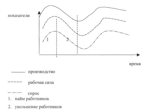 Рис. 54. Стратегия переменного объема производства при постоянной численности рабочей силы 1) сверхурочные работы, привлечение субподрядчиков; 2) отгулы, гибкий график. 3. Переменный объем производства при переменной численности рабочей силы. Здесь предусматривается периодический найм и увольнение работников в связи с изменением объема производства.