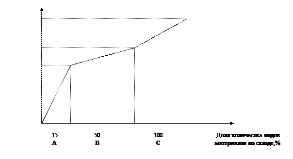где: Рi – потребность в i-м материале; Nij – норма расхода i-го материала на выпуск j-й продукции; Пj – плановый выпуск j-й продукции. При стохастическом методе расчета потребности в материалах учитываются данные прошлого периода, и на основе прогноза устанавливается ожидаемая потребность. Наиболее простым способом является метод динамических коэффициентов. При таком подходе данные о фактических расходах прошлого периода умножают на коэффициент изменения производственной программы и а коэффициент, учитывающий экономию материальных ресурсов в связи с внедрением организационно-технических мероприятий. Для более точных расчетов потребности в материалах осуществляют дифференцированный подход в зависимости от вида материала. Для этой цели проводят два вида анализа: А-В-С-анализ и X-Y-Z-анализ. А-В-С-анализ классифицирует виды материалов в зависимости от их удельного веса в себестоимости продукции, строится коммулятивная кривая по накопленным частотам.