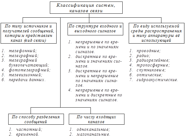 Рис. 4. Классификация систем, каналов связи 1. По типу источников получателей сообщений, которым предоставляется канал, иными словами по видам связи каналы делятся на телефонные, телеграфные буквопечатающие, фототелеграфные, телевизионные, передачи данных и др. 2. По структуре входного и выходного сигнала каналы связи подразделяются на: - непрерывные по времени и по значениям сигналов); - дискретные (по времени и по значениям сигналов); - непрерывные по значениям сигналов и дискретные по времени; - дискретные по значениям сигналов и непрерывные по времени (иногда называемые каналами постоянного тока). При этом следует понимать, что дискретными по значению сигналов называется канал, у которого число сигналов любой конечной длительности конечно или счетно. В противном случае канал называется непрерывным по значению сигналов, а дискретным каналом по значениям времени называется канал, каждый сигнал которого задан последовательностью значений в отдельные моменты времени (числе таких моментов конечно или счетно). В противном случае канал называется непрерывным по времени. Относительность понятия канала связи иногда позволяет в составе общего канала выделять дополнительные каналы (т.н. подканалы) других типов. Например, в составе канала передачи данных, являющегося дискретным, как правило, можно выделить дискретный подканал, канал постоянного тока и непрерывный канал. 1. По виду используемой среды распространения и типу аппаратуры, осуществляющей ее использование, принято выделять: - проводные каналы; - радиоканалы; - радиорелейные каналы; - тропосферные и космические каналы; - каналы волновой связи; - оптические каналы и др. Рассмотренные признаки классификации каналов могут использоваться для классификации линий связи в случае, если линии объединяют однотипные каналы. Кроме того линии связи классифицируются по числу входящих в них каналов и по признакам. Определение канал связи, линия связи, сигнал, сообщение являются наиболее употребляемыми в профессиональной деятельности военных связистов. Твердое знание этих определений и классификаций сигналов каналов, линий связи поможет ориентироваться в многообразии реальных каналов и линий связи, в быстрейшем профессиональном становлении офицера-связиста. Типы каналов, по которым передаются сигналы, многочисленны и разнообразны. Различают каналы проводной связи (воздушные, кабельные, световодные и др.) и каналы радиосвязи. Кабельные линии связи являются основой магистральных сетей дальней связи, по ним осуществляется передача сигналов в диапазоне частот от десятков кГц до сотен МГц. Весьма перспективными являются волоконно-оптические линии связи. Они позволяют в диапазоне 600...900 ТГц (0,5...0,3 мкм) обеспечить очень большую пропускную способность (сотни ТВ или сотни тысяч ТФ каналов). Наряду с проводными линиями связи широко используются радиолинии различных диапазонов (от сотен кГц до десятков ГГц). Эти линии более экономичны и незаменимы для связи с подвижными объектами. Наибольшее распространение для многоканальной радиосвязи получили радиорелейные линии (РРЛ) метрового, дециметрового и сантиметрового диапазонов на частотах от 60 МГц до 15 ГГц. Разновидностью РРЛ являются тропосферные линии с использованием отражений от неоднородностей тропосферы. Всё большее применение н