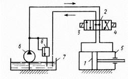 Гидравлические, пневматические механизмы (рис.1.5). В этих механизмах для преобразования движения кроме твердых тел участвуют жидкие или газообразные тела. На рис.1.5 приведена схема гидравлического механизма, предназначенного для привода в движение поршня 1 с помощью распределителя 2. Жидкость в цилиндр 5 поступает из распределителя в результате поочередного включения электромагнитов 3 и 4. Гидравлическая схема включает в себя также насос 6, бак 7 и клапан 8. В пневматических механизмах насос заменяют источником сжатого воздуха.
