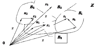 Рис.1. Разбиения пространства принимаемых колебаний на непересекающиеся области Если правило решения выбрано, то это означает, что каждой точке пространства принимаемых колебаний (концу вектора z = s + n) приписывается одна из m гипотез, т.е. определенный передаваемый кодовый символ bi. Пространство принимаемых сигналов окажется при этом разбитым на m непересекающихся областей Вi пространства Z, каждая из которых соответствует принятию определённой гипотезы. В такой трактовке различные приёмные устройства отличаются друг от друга способом разбиения пространства сигналов на области Вi, т.е. правилом принятия решения[4]). Возможное разбиение схематически показано на рис. 1. В двоичной системе пространство Z разбивают на две непересекающиеся области В 0 и В 1. Пусть на отрезке [0, T ] принимается колебание z (t) =si (t) + n (t), где si (t) — полезный сигнал в месте приёма, прошедший канал связи, a n (t) - реализация аддитивной помехи. Если помехи отсутствуют, возможные значения z (t) изображаются точками si (i =0, 1, 2,..., т- 1). При наличии помехи и передаче сигнала с номером i точка принимаемого колебания z отклоняется от точки si. На рис. 1 это показано для сигналов s 1(t), s 2(t) и si (t). Область Bi содержит точку si. В тех случаях, когда помеха не выводит точку z за пределы области Bi, решение оказывается верным при сигнале si (см. область B 3). В противном случае возникает ошибка. Изменяя границы между областями, можно влиять на вероятность ошибочного приёма отдельных передаваемых символов. Например, если в разбиении, показанном на рис. 1, расширить область Bi. за счёт области B 3, то уменьшится вероятность ошибочного приёма символа b 3, вместо передаваемого символа bi. Однако в этом случае возрастает вероятность ошибочного приёма bi при передаваемом b 3. Очевидно, всегда существует такое расположение областей, которое в определённом смысле лучше всякого другого. Здесь, в зависимости от выполняемой задачи конкретным видом сигнала выбирается критерий определения границ областей Вi пространства Z. Вывод. Задачей приема является выбор из множества гипотез (известных по своим параметрам сигналов) какой-то одной наиболее подходящей, правдоподобной и таким образом принятия решения о том, какое сообщение было передано. Решением такого рода задач занимается математическая статистика. Поэтому задача оптимального приема может рассматриваться как статистическая задача. Date: 2015-07-24; view: 1023; Нарушение авторских прав |