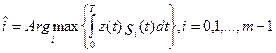 Рис.1. Оптимальный демодулятор при точно известных сигналах, построенный по корреляционной схеме Здесь блоки " ´ " — перемножители; Г 0, Г 1 — генераторы опорных сигналов s 0(t), s 1(t); ò-интеграторы; "-" — вычитающие устройства; РУ — решающее устройство, определяющее в моменты времени, кратные Т (при замыкании ключа), номер i -ветви с максимальным сигналом (i =0, 1). При т > 2 в схеме рис. 1 и других нижеприведённых схемах растет соответственно число ветвей обработки сигнала, попадающих на РУ.[1]) Если сигналы bi (t) выбраны таким образом, что все их реализации (а следовательно, и все реализации si (t)) имеют одинаковые энергии[2]) (Ei =const), алгоритм приёма (2) (и соответственно его реализация) упрощается (отпадает необходимость в вычитающих устройствах) и принимает вид