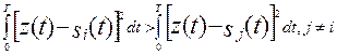 Из (5) видно, что правило решения не изменится, если сигнал z (t), поступающий на вход демодулятора, умножить на любое число. Поэтому система, в которой все реализации сигнала имеют равную энергию, отличается тем, что оптимальный алгоритм приёма в ней не требует знания "масштаба" приходящего сигнала или, другими словами, знания коэффициента передачи у канала. Эта особенность обусловила широкое распространение систем сигналов с равной энергией, что важно для каналов с замираниями, в которых коэффициент передачи флуктуирует (радиоканал). Заметим, что для двоичной системы неравенство (3) можно представить в более простом виде: