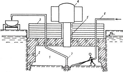 Рисунок 3.16. Через прикамерок рабочие входят в шлюз, где давление постепенно повышают до имеющегося в рабочей камере. Через 5…15 мин человеческий организм приспосабливается к условиям повышенного давления. Длительность пребывания людей при повышенном давлении воздуха строго ограничена требованиями техники безопасности. Выход через шлюз требует примерно в 3…3,5 раза больше времени, чем вход. Из-за ограничения максимального давления кессон можно опустить на глубину не более 35…40 м. Работы по возведению фундаментов кессонным методом дорогостоящие. Их применяют при наличии в грунте крупных включений или при необходимости опирания фундамента на неровную поверхность скалы. Для разработки грунта применяют гидромониторы, а для удаления его наружу - эрлифты.