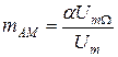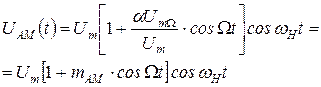 где a - коэффициент пропорциональности. Аналитическая запись определения амплитудной модуляции (3) иллюстрируется рис. 3 для случая гармонического первичного сигнала, При АМ приращение DUm(t) мгновенного значения огибающей несущего колебания пропорционально приращению мгновенного значения модулирующего сигнала UW(t). На рис. 3 огибающая показана штриховой линией. График АМ сигала UАМ(t) лишь касается её, не пересекая. Понятно, что огибающая не должна принимать отрицательных значений.