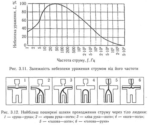 Опір тіла людини зменшується також при захворюваннях шкіри, центральної нервової та серцевосудинної систем, проявах алергічної реакції тощо. Тому нормативні акти про охорону праці передбачають обов'язкові попередній та періодичні медичні огляди працівників (кандидатів у працівники) для встановлення їх придатності щодо обслуговування діючих електроустановок за станом здоров'я. Вид та частота струму, що проходить через тіло людини, також впливають на наслідки ураження. Постійний струм приблизно в 4—5 разів безпечніший за змінний, що підтверджують дані табл. 3.5. Це пов'язано з тим, що постійний струм у порівнянні зі змінним промислової частоти такого ж значення викликає більш слабші скорочення м'язів та менш неприємні відчуття. Його дія, в основному, теплова. Однак, слід зауважити, що вищезазначене стосовно порівняльної небезпеки постійного та змінного струму є справедливим лише для напруги до 500 В. При більш високих напругах постійний струм стає небезпечнішим ніж змінний. Частота змінного струму також відіграє важливе значення стосовно питань електробезпеки. Так найбільш небезпечним вважається змінний струм частотою 20—100 Гц (рис. 3.11). При частоті меншій ніж 20 або більшій за 100 Гц небезпека ураження струмом помітно зменшується. Струм частотою понад 500 кГц не може смертельно уразити людину, однак дуже часто викликає опіки. Тривалість дії струму на організм людини істотно впливає на наслідки ураження: чим більший час проходження струму, тим швидше виснажуються захисні сили організму, при цьому опір тіла людини різко знижується і важкість наслідків зростає. Наприклад, для змінного струму частотою 50 Гц гранично допустимий струм при тривалості дії 0,1 с становить 500 мА, а при дії протягом 1 c — вже 50 мА (табл. 3.8).