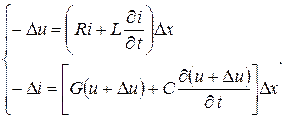 Обозначим: u – напряжение между верхним и нижним проводом в точке x; D u – приращение напряжения на участке D x; i – ток в точке x; D i – приращение тока на участке D x. Уравнения для приращений напряжения и тока на элементе D x линии запишутся: