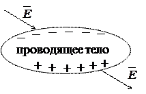 Рис. 15.5. разделение зарядов в проводящем теле Все точки тела будут иметь один и тот же потенциал (иначе появилось бы упорядоченное движение зарядов). Поверхность тела эквипотенциальна. Вектор напряженности внешнего поля в любой точке поверхности подходит к ней под прямым углом. Внутри проводящего тела напряженность равна нулю, так как внешнее поле компенсируется полем зарядов, расположившихся на поверхности тела. На границе раздела проводящего тела и диэлектрика при отсутствии тока по проводящему телу выполняются два условия: 1. Отсутствует тангенциальная (касательная к поверхности) составляющая напряженности поля
