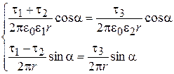 Расчет поля в верхней полусфере ведется от двух зарядов: реального t1 и фиктивного t2, расположенных симметрично относительно границы раздела, причем среда всюду имеет диэлектрическую проницаемость e1. Расчет поля в нижней полусфере ведется от заряда t3, расположенного в той же точке, что и t1. Среда при этом всюду имеет проницаемость e2. Граничные условия реальной задачи