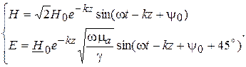 Рис. 18.7. Распространение напряженности магнитного поля в проводящей среде Мгновенные значения H и E определяются аргументом синуса, который в (18.20) зависит от z и