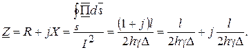 При протекании постоянного тока сопротивление R=l/ γ s. При протекании переменного тока магнитное поле меняет распределение плотности тока и оказывает влияние, как на реактивную, так и на активную составляющие сопротивления. Для определения активного и внутреннего реактивного сопротивлений проводников при протекании переменного тока используют теорему Умова-Пойнтинга в комплексной форме. Подсчитывается поток вектора Пойнтинга через боковую поверхность проводника на длине в 1 метр и делят его на квадрат тока, протекающего по проводнику. В результате получают комплексное сопротивление проводника на единицу длины: